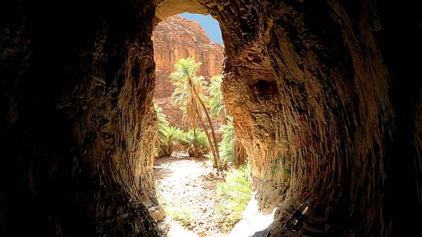 | Verlässt man die RR 107 Richtung Aoukerda, lohnt es, dort zu Fuß auf Entdeckungstour zu gehen. Ein Felsdurchbruch (Tunnel) führt auf die andere Seite bis in ein Flussbett, dort bieten sich weitere spannende Ausblicke |