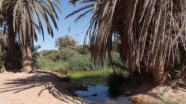 | Zwischen den hoch aufragenden roten Felsen der beeindruckenden Schlucht von Aït Mansour kann man unter schattenspendenden Palmen sogar ein erfrischendes Bad genießen. |